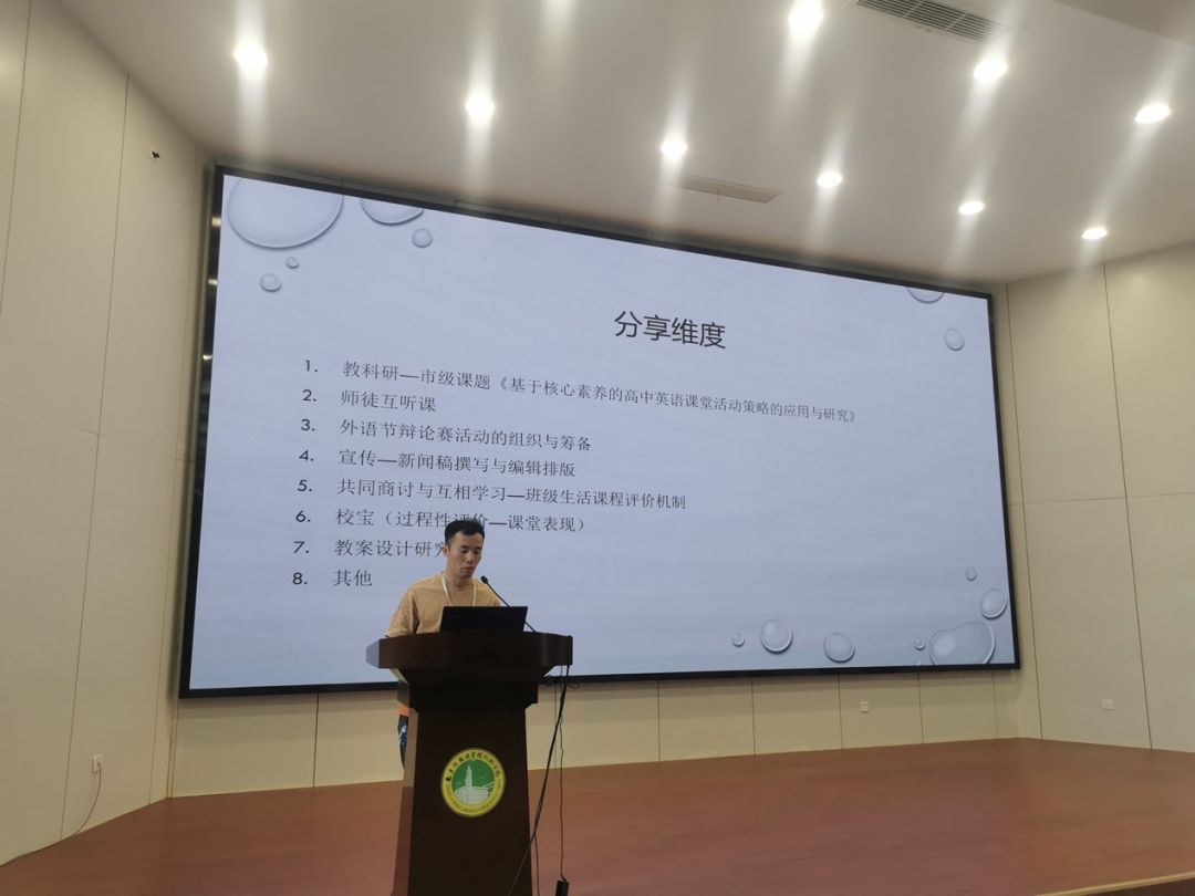 豆大洋老师和李岩辉老师分别汇报了参与“教师青蓝工程”师徒结对工作的学习成果。豆大洋跟随导师薛晓梅老师学习,他在学习汇报中表示在师徒互相听课和研讨中,自己学习和观摩多种教学方法,有了诸多的创新和反思。而参与外语节的组织和筹备工作,不仅锻炼了自己的团队协作能力和沟通能力,也有了许多策划和组织活动的体验和心得。