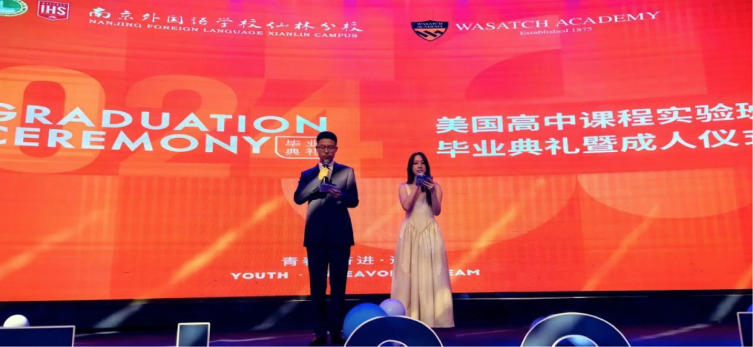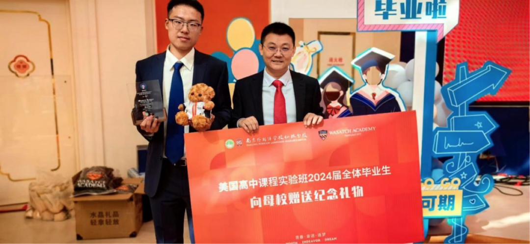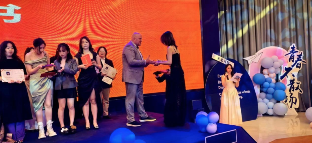 颁发优秀毕业生证书的环节在年级组负责人刘加兵主任的精心策划下,呈现出别样的用心与温暖。每为优秀毕业生从入校到达平时表现、从个人亮点到最终录取,刘主任都如数家珍,每一处细节都体现出对同学们的关怀与期望。刘主任同时也对本届所有毕业生表示了祝贺与赞赏,他指出本届毕业生美国Top50大学录取率100%,美国Top40大学录取率80.9%,美国Top30大学录取率42.6%。他的话语中充满了对这届学生的骄傲与期望。而随后学生们朗诵了自己用心编写的诗歌,用充满真诚的语句感恩了自己的努力、学校的培育与师长的付出。