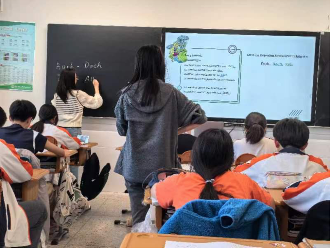 课堂上选用了多首德语诗歌作为素材,让学生通过自主发现和讨论,理解并掌握了诗歌韵律和格律的规律,这种方式培养了学生自主学习和探究的精神。课上我们通过读诗、听诗、选词填空等多种活动形式,使学生在参与中更加积极主动,也增强了他们对诗歌韵律的感受力和理解力。但是在本次教学实践中,也发现了需要改进的地方:在小组合作分析诗歌格律时,发现个别学生对“音节”的概念理解不准确,导致一开始无法正确判断轻重音。在今后的教学和备课中,我会更加细致,考虑到部分学生基础知识欠缺的情况,在课上通过讲解和示例,帮助他们更好地理解。