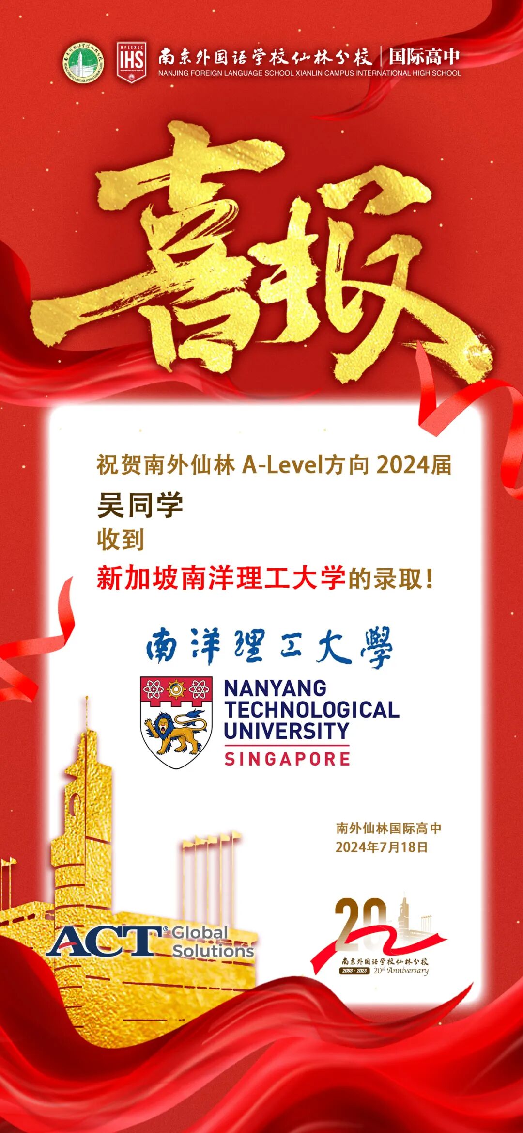 祝贺南外仙林A-Level方向2024届吴同学收到新加坡南洋理工大学录取!