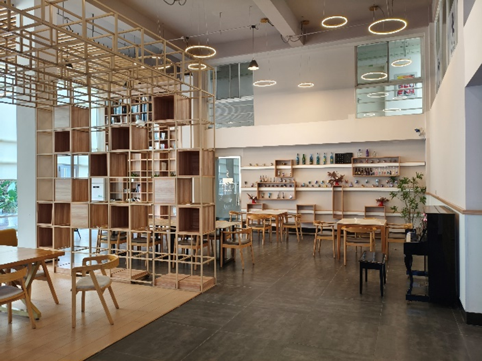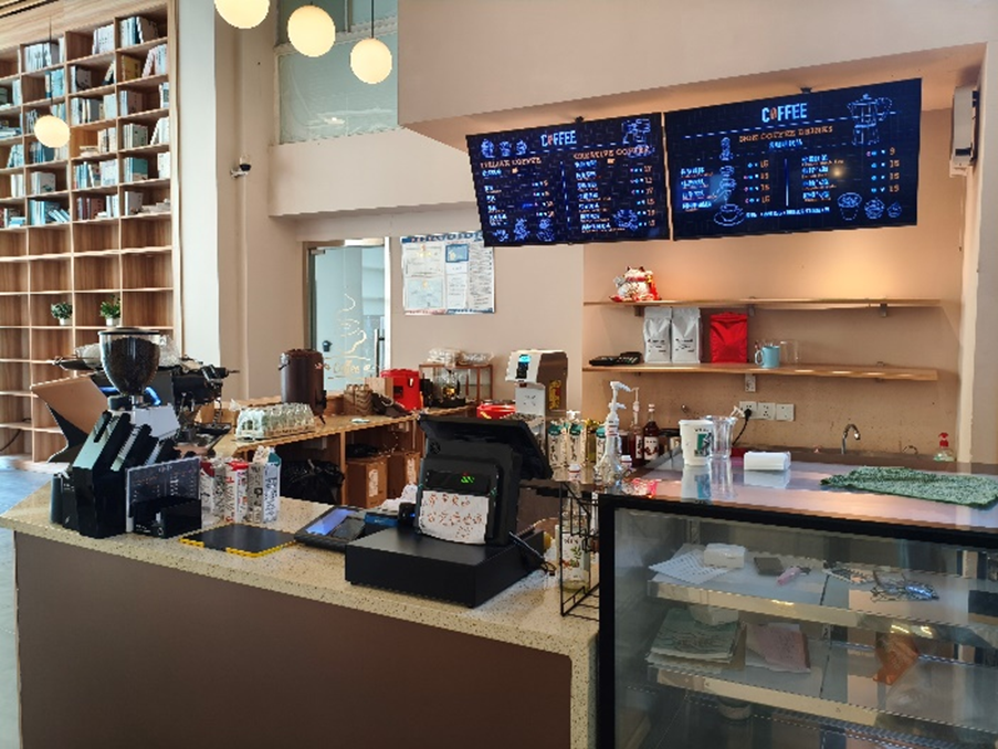 The coffee shop is a space where students, staff, and teachers can buy coffee and drinks. It is a comfortable space with couches and large tables. Students and faculty at the school can stay in the coffee shop to work or talk with each other. The coffee shop is also a great space to host market events and club meetings. The prices are low compared to coffee shops off-campus.