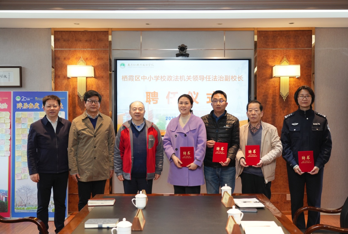 聘任仪式由校党委书记李习凡主持。邹正校长逐一为受聘的副校长颁发聘书,并合影留念。栖霞区司法局党组书记、副局长张奋林受聘为法治副校长,区司法局关工委副主任李明贤受聘为爱心副校长,仙林派出所民警徐静受聘为治安副校长,仙林司法所所长殷为民受聘为法治宣传副校长。仙林司法所三级主任科员李典典担任联络员。